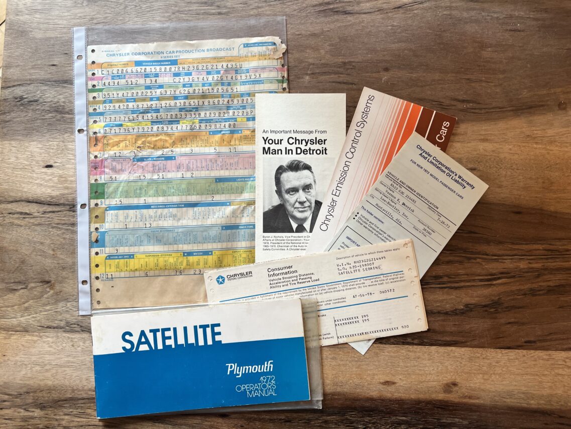 Dieser Plymouth ist ausserordentlich gut dokumentiert. Es sind Built-Sheet, Handbuch und weitere Papiere der Erstauslieferung vorhanden (siehe Fotos). Der Wagen wurde 2014 von Mississippi in die Schweiz überführt und hat mittlerweile 75’000 Meilen auf der Uhr. Aber auch diese Schönheit altert und so musste in den letzten Jahren einiges gemacht werden.